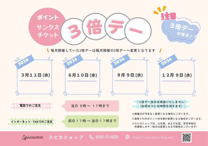 2026年は毎月開催の2倍デーではなく年4回開催の3倍デーへ変更 となります。